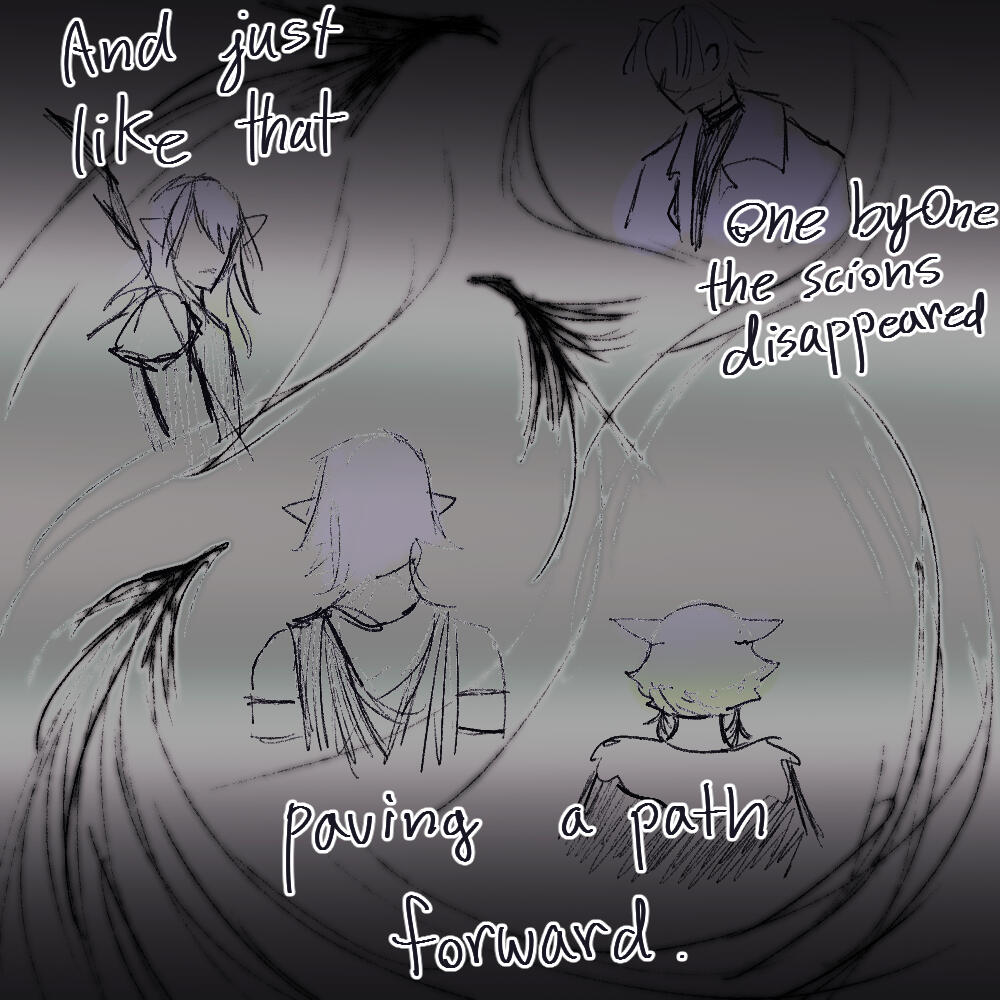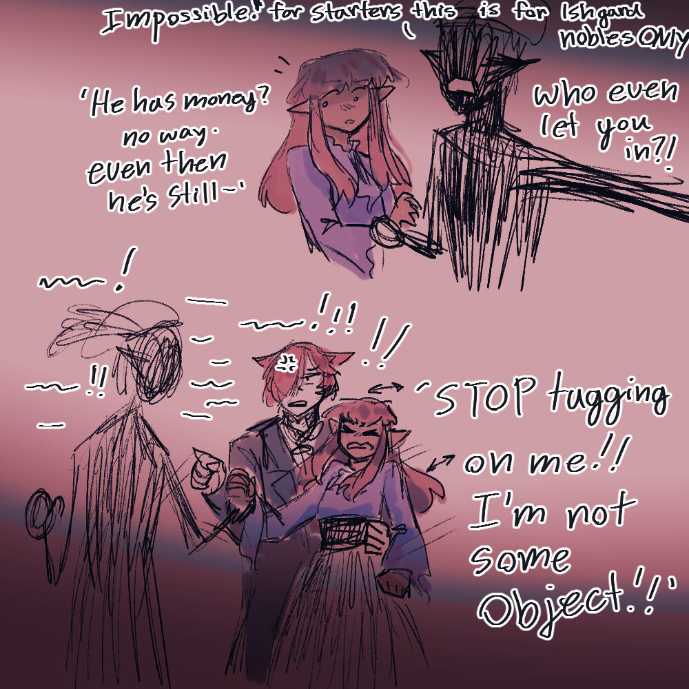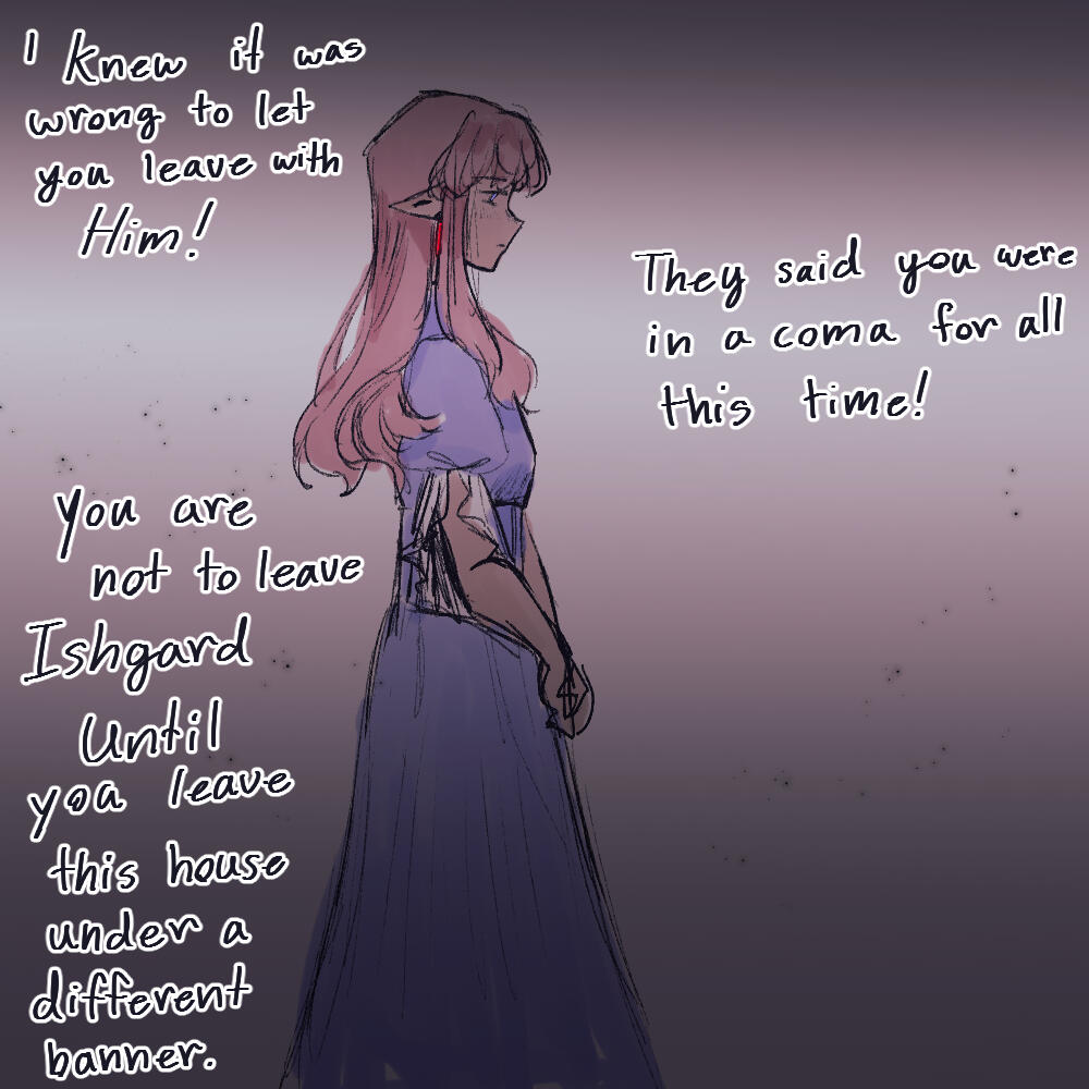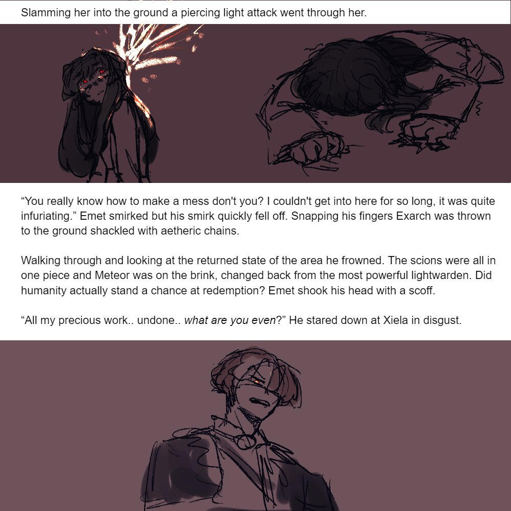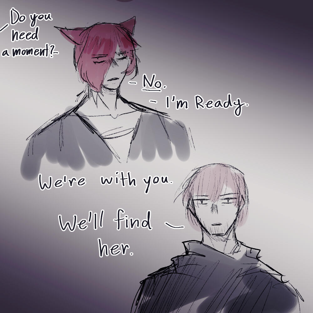 She could not stand being near him at the moment, but she was harassed by Emet-Selch, for he could see she was put off by the Exarch.