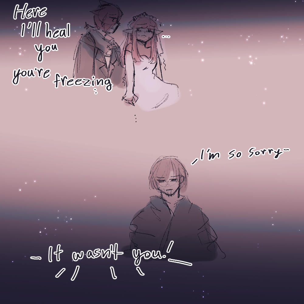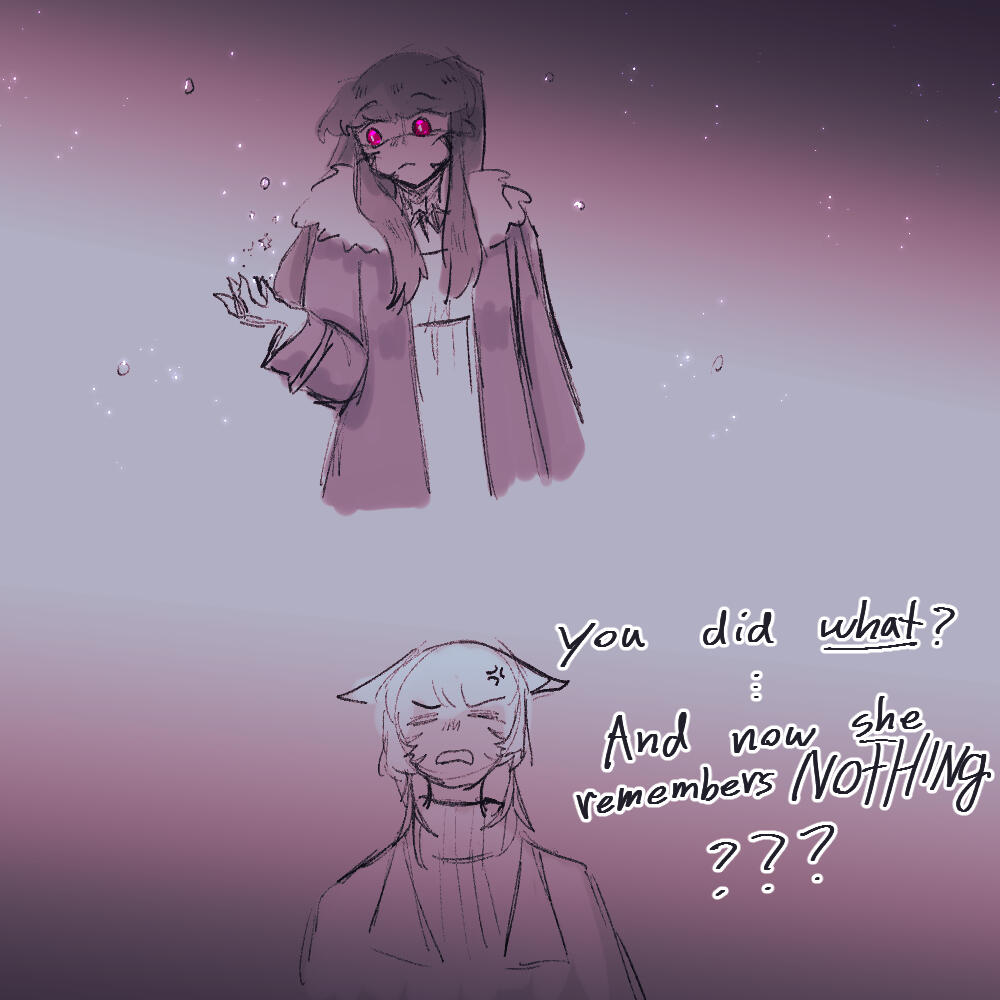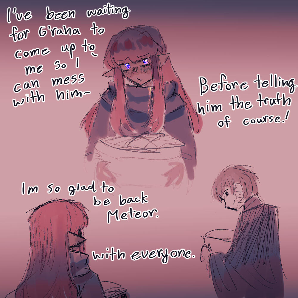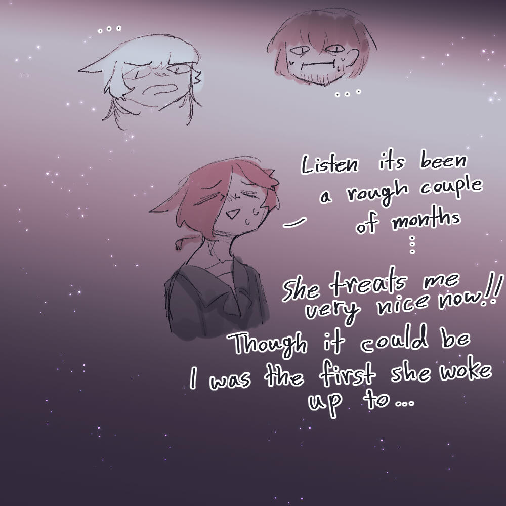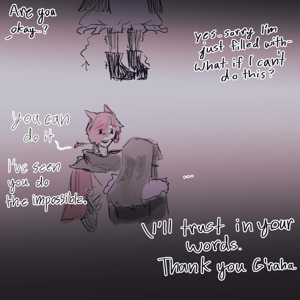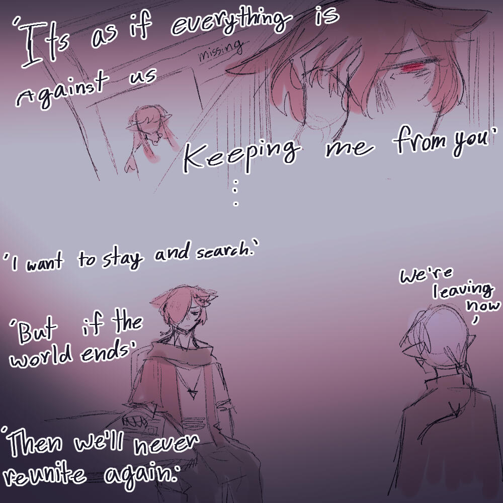 She could not stand being near him at the moment, but she was harassed by Emet-Selch, for he could see she was put off by the Exarch.