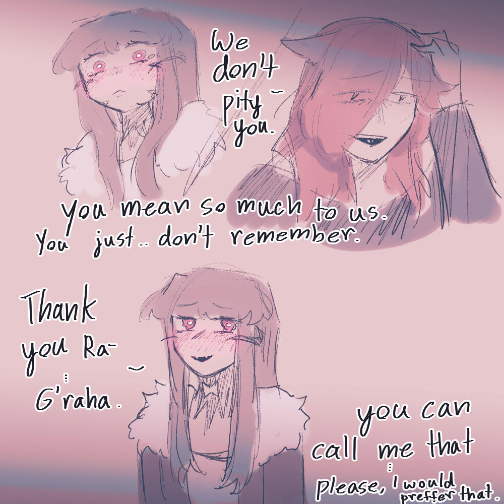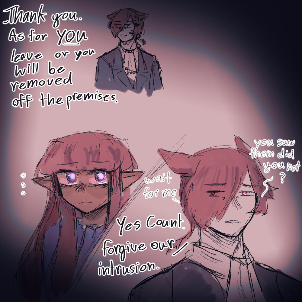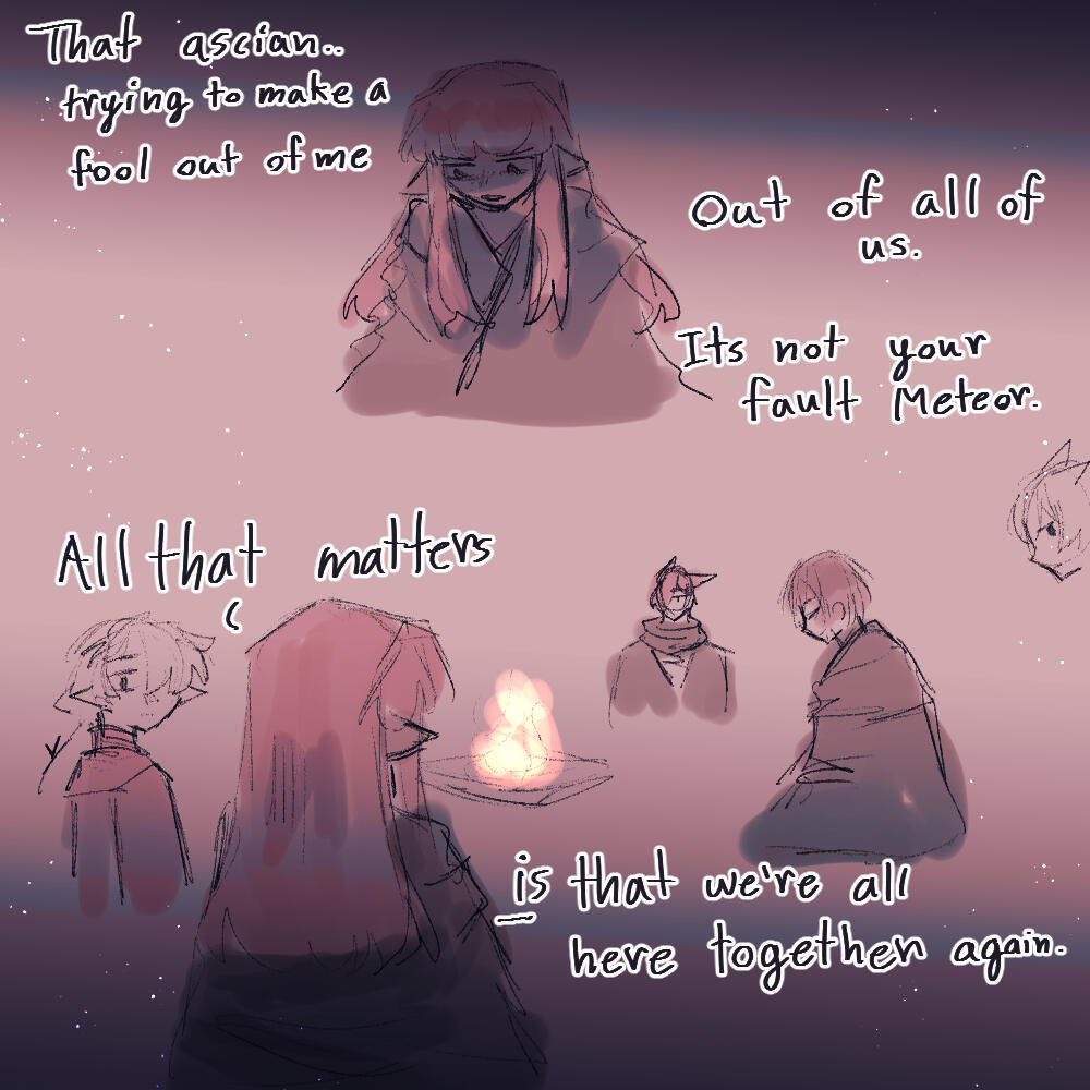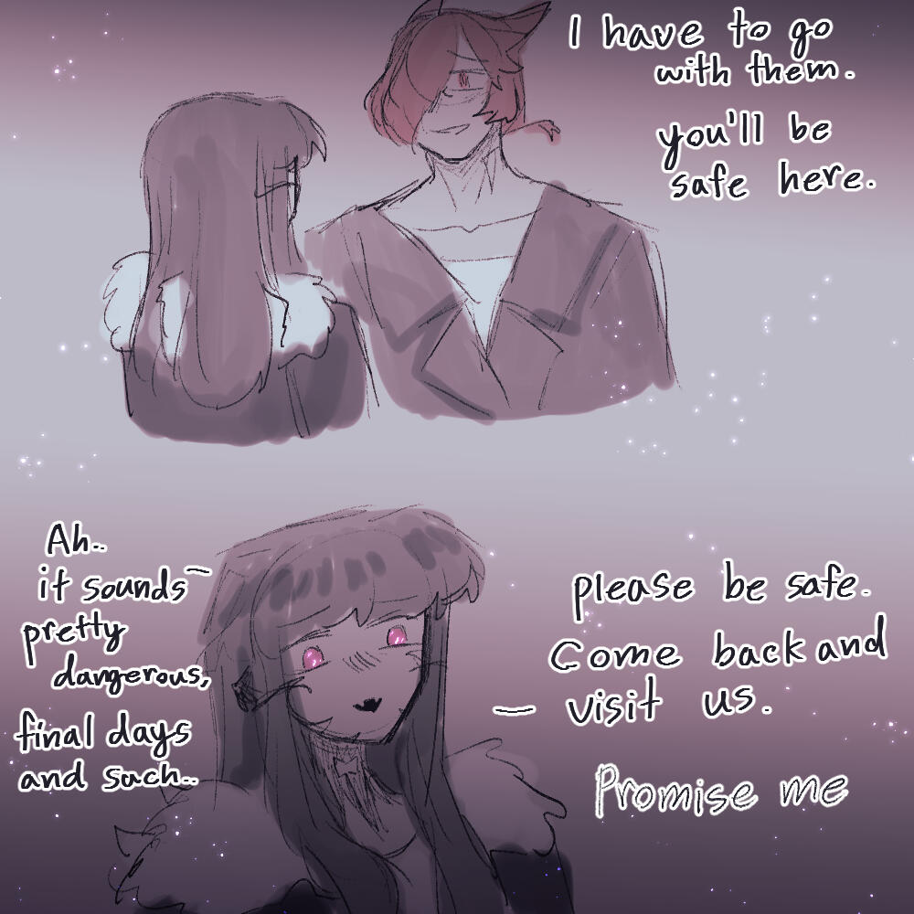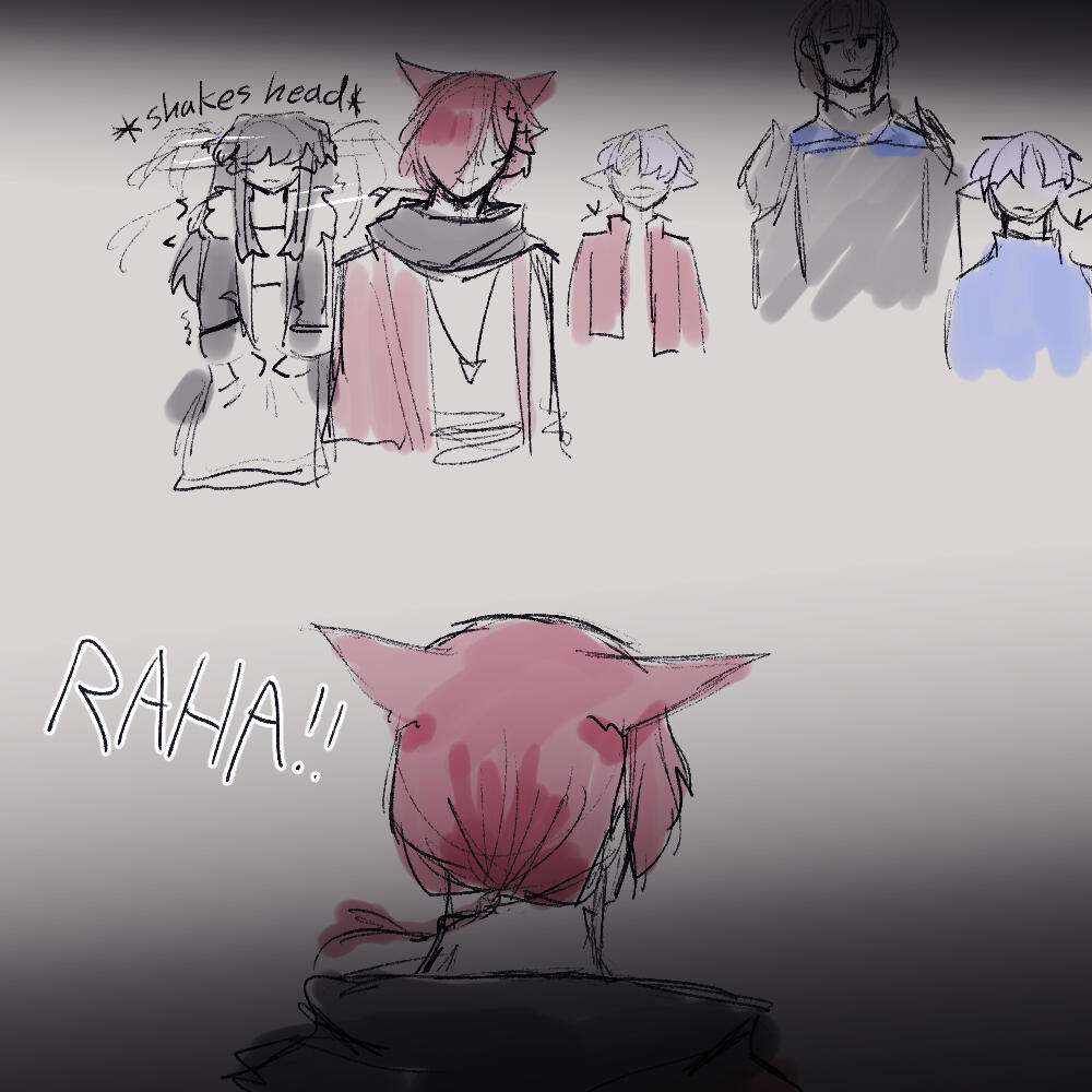 She could not stand being near him at the moment, but she was harassed by Emet-Selch, for he could see she was put off by the Exarch.