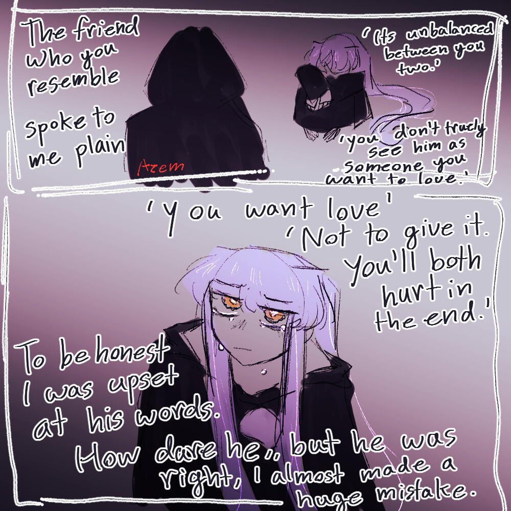 Mind was burning with anger, as if I may be engulfed whole in it's wake.Azem proposed a question. Do I really love Hades?The anger toward you wasn't founded, even if it was subconscious."Of course I do-", before the words even left my mouth he approached closer, his eyes burned into mine and knocked the wind out of my lungs.Trembling, my core was unable to support my lies that continued to spill from my mouth. Pulling no punches, slicing to the matter at hand."Even when you feel jealousy of him being with someone else, it is not out of love you do this.", he let out a breath, a quiet repose, "You love the idea of being loved. But to give it is another story Persephone."Embarrassment was flooding, I want to curl up and disappear from the truth."You'll hurt each other past the point of return if you continue in this way."... He was right. We talked for hours after, calmly, discussing it truthfully, not holding back to keep face.It wasn't until many years later I saw red again. And that's when I knew I had found the one I wanted to give my all to.